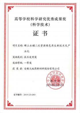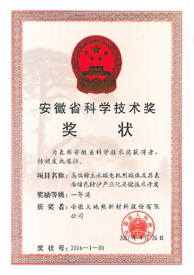 大地熊公司始終堅持以“科技創(chuàng)新”為企業(yè)之本,通過自主研發(fā)、技術引進、科技成果轉化、產(chǎn)學研合作等途徑,形成了先進的企業(yè)技術創(chuàng)新體系與核心競爭力。在稀土永磁產(chǎn)品制備方法、表面防護、制品加工以及檢測測試等方面取得了較多優(yōu)秀成果。公司已授權專利148件,國內外發(fā)明54件。主導制定《再生釹鐵硼永磁材料 》國家標準1項,參與制定和修訂《燒結釹鐵硼永磁材料》等國家標準7項。榮獲安徽省科技進步一等獎、二等獎、三等獎各1項;教育部技術發(fā)明一等獎、二等獎各1項、國家重點新產(chǎn)品2件、安徽省新產(chǎn)品4件、高新技術產(chǎn)品7件。